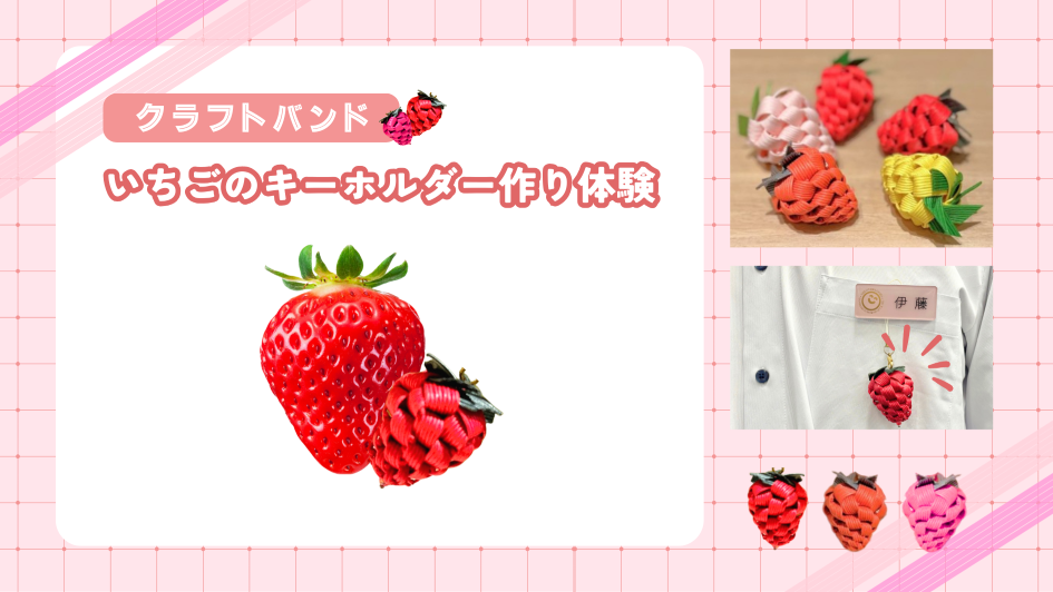 小さなお子さまでも安心してチャレンジできる簡単ワークショップです。期間中はスタッフも同じいちごのキーホルダーを身に着けています。思い出づくりに、ぜひご参加ください♪